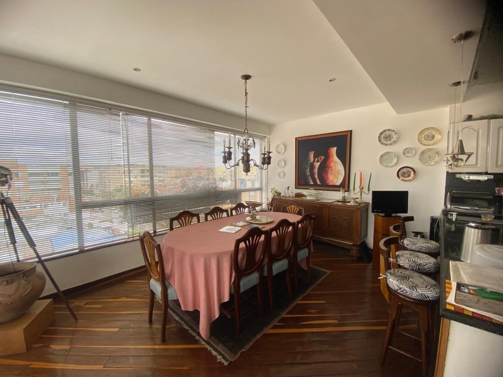 Espectacular pent-house dúplex, ubicado en piso quinto y sexto, pisos en madera zapán en primer piso y en alfombra en el segundo piso, excelente iluminación y ventilación natural, sol en la mañana y en la tarde. En primer nivel consta de: hall de acceso, baño social, estudio, sala auxiliar y sala principal las cuales comparten una chimenea, comedor, cocina abierta, integral y a gas con amplío almacenamiento, área de labores y cuarto del servicio. En segundo piso consta de: estar de alcobas, dos alcobas auxiliares que comparten un baño, alcoba principal con dos vestier, baño privado con jacuzzi. Cuenta con dos parqueaderos en línea y cubiertos, un depósito. El edificio cuenta con 6 pisos, tiene 1 salón social, 1 ascensor que llegan a los entre pisos, zona infantil y de ejercicios, edificio automatizado, 16 apartamentos en total.