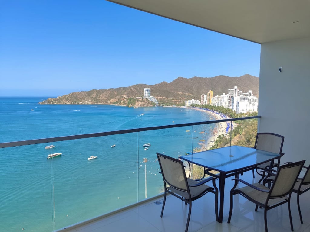 Apartamento cuenta con 3 alcobas con buenos espacios y aires acondicionados instalados, la alcoba principal tiene una vista amplia a las playas del rodadero y las montañas, una cocina completamente dotada, terraza amplia. El edificio tiene zonas comunes como piscina, BBQ, sauna, turco, salón social y gimnasio. Se encuentra ubicado en primera línea de mar, cerca a lugares de interés como las playas del rodadero, super mercados, droguerías, notarias y restaurantes.
